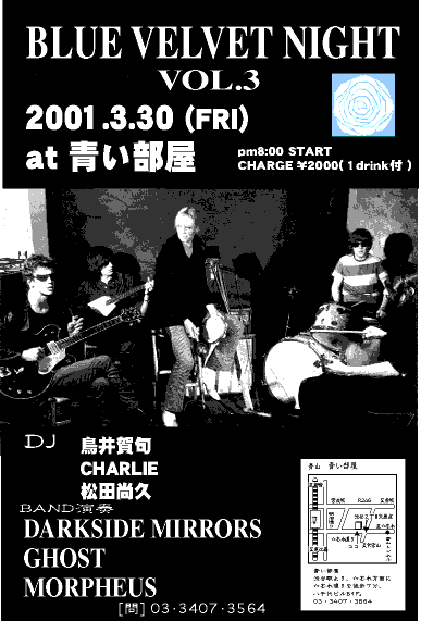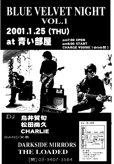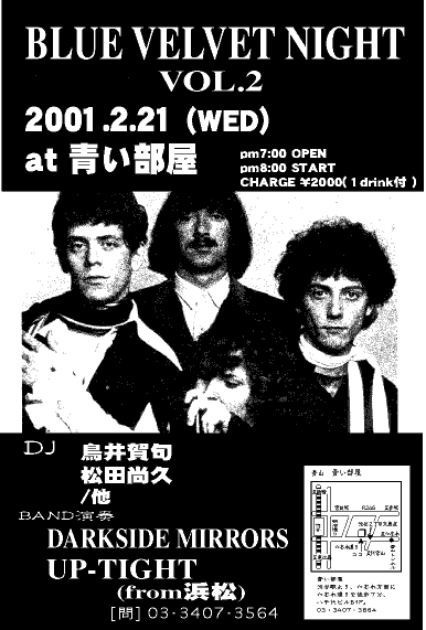 今年の1月から始まり今回でついに4回目を迎えるBLUE VELVET NIGHT! このイベントのハウスバンドを務めるのはダークメルヘン迷宮サイケバンド・DARK SIDE MIRRORS。イベント名は、僕らダークダイドミラーズで名付けました。デビットリンチの名作『ブルーベルヴェット』は御存知でしょうか? そんな雰囲気とベルヴェットアンダーグラウンドのイメージでできたこのイベント。 詩人やダークサイドミラーズも毎回出演! 音楽評論家、鳥井賀句氏プロデュース。 (青い部屋代表 尚作) |